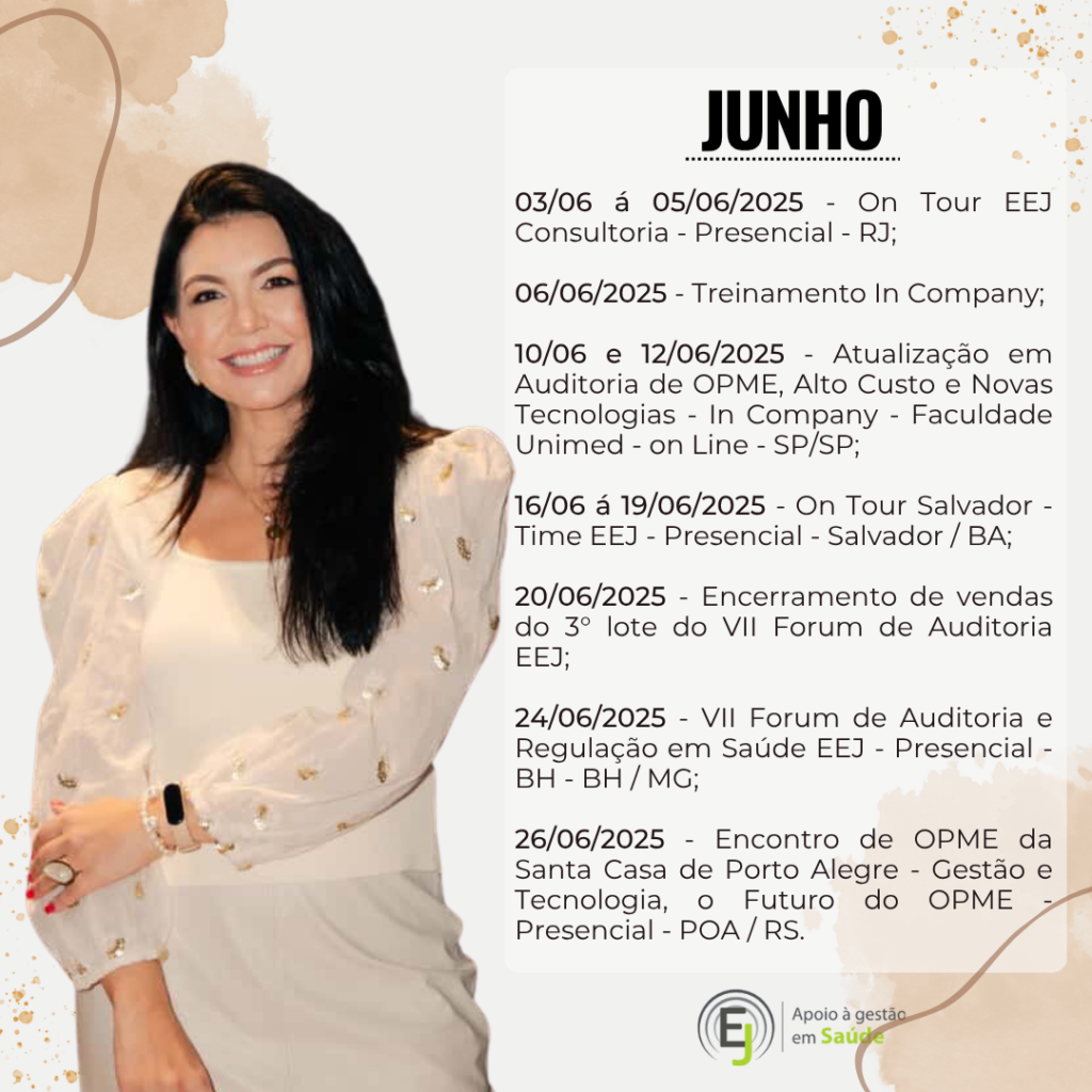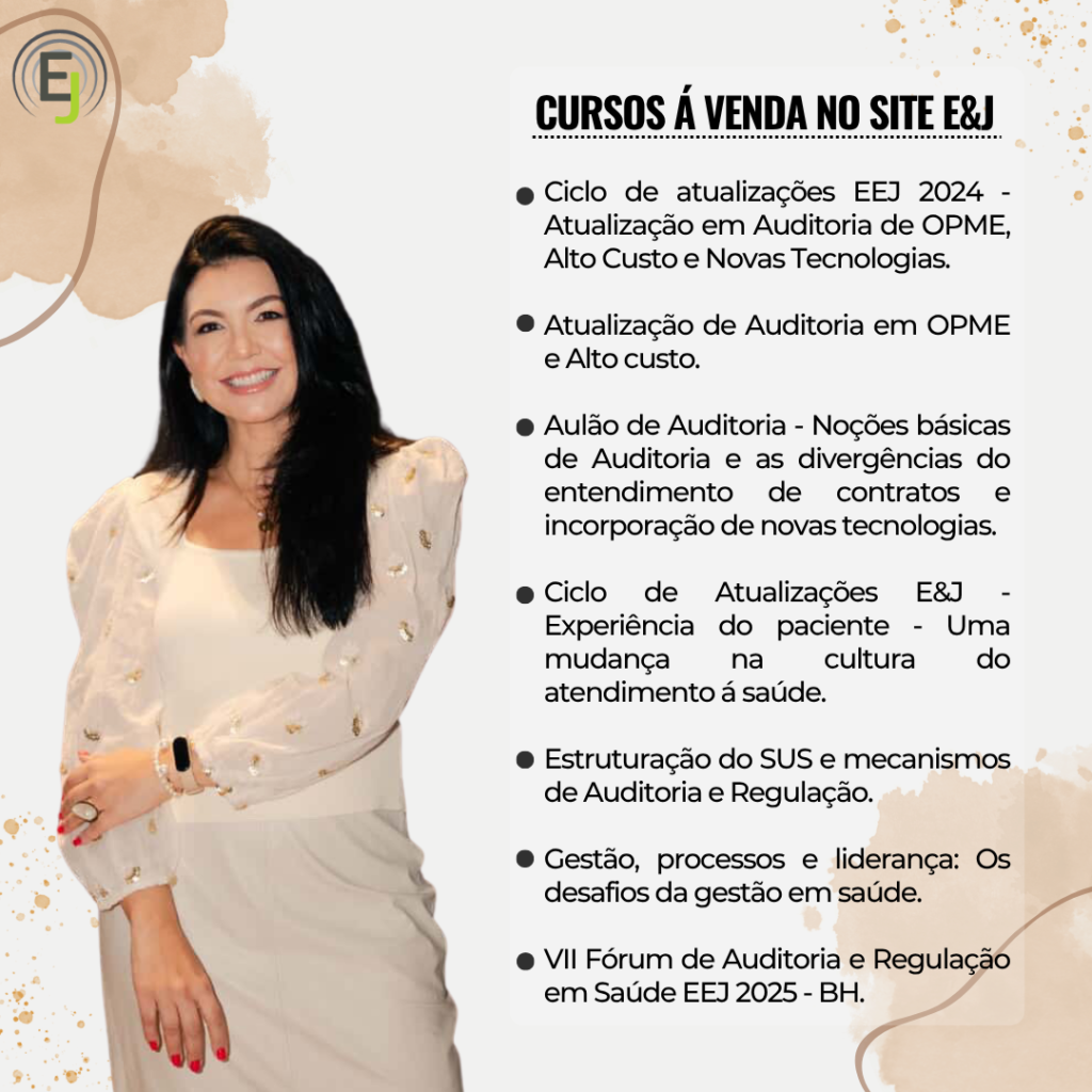 CEO da Empresa E&J Apoio à Gestão de Saúde e Educar LTDA, desenvolvendo atividades de Treinamentos, Consultoria e Auditoria, para o Sistema de Saúde. Tem na carteira de clientes: Amil – MG, Usisaúde, Promed – MG, Professora Convidada do Módulo de Auditoria em Enfermagem e Implantes de OPME’s da Pós Graduação de Auditoria em Saúde da Fundação Unimed e do Curso de OPME da Fundação Unimed; Professora Convidada do Módulo de Modalidades de Auditoria da Pós Graduação em Auditoria da Faculdade de Ciencias Médicas – MG.