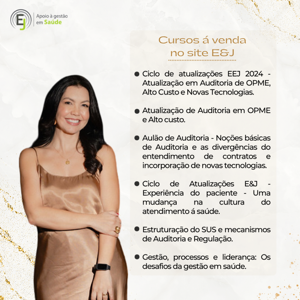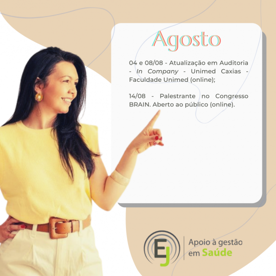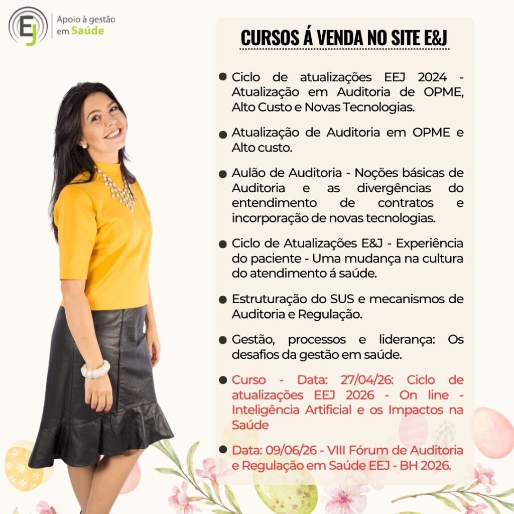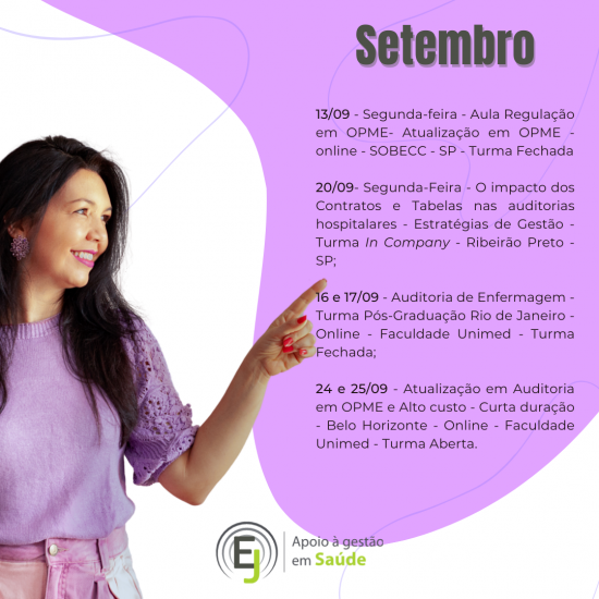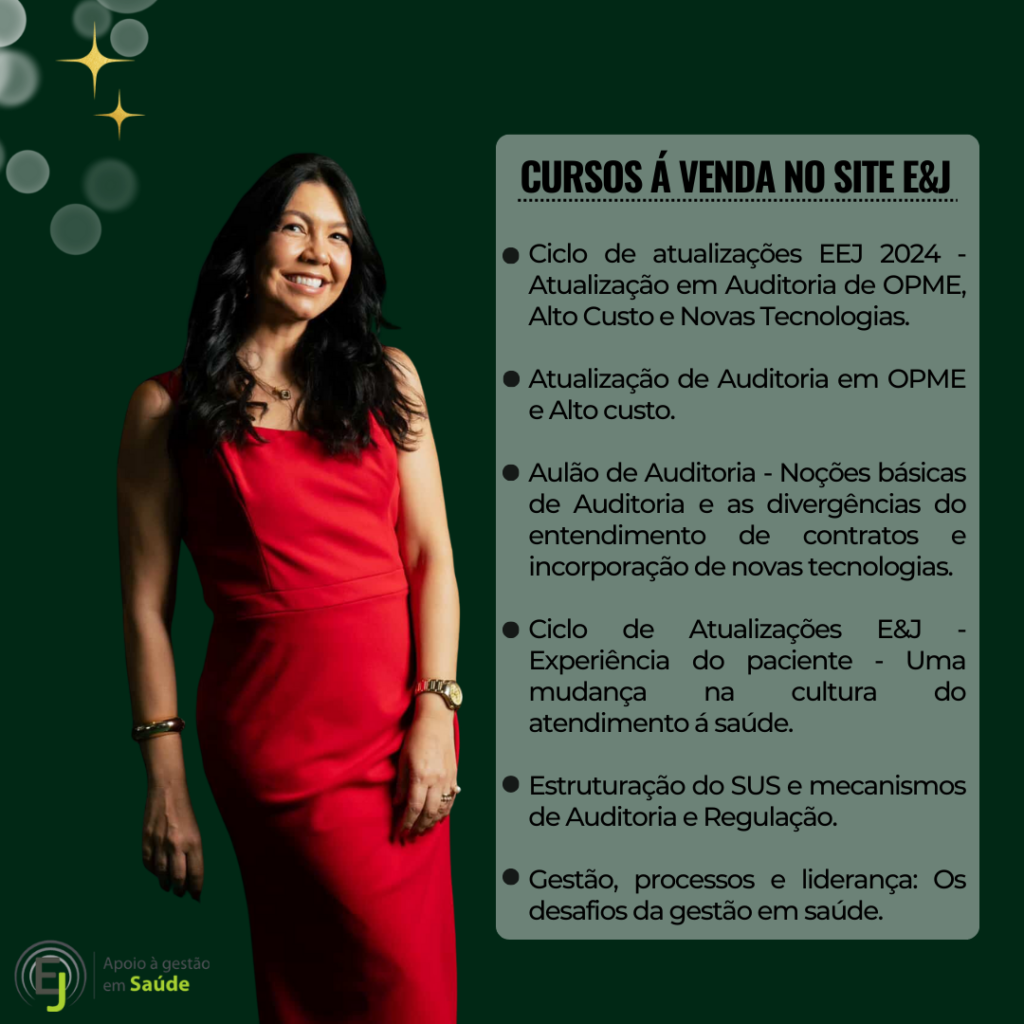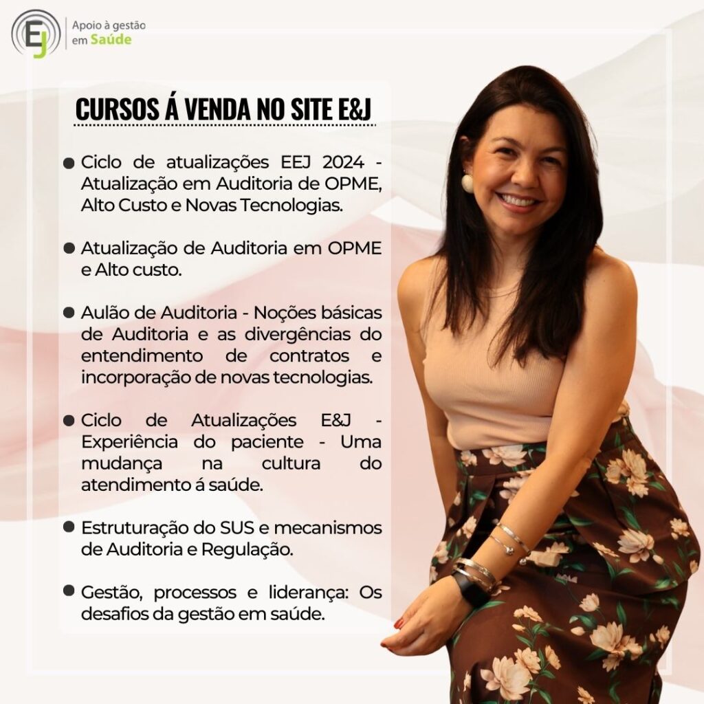 CEO da Empresa E&J Apoio à Gestão de Saúde e Educar LTDA, desenvolvendo atividades de Treinamentos, Consultoria e Auditoria, para o Sistema de Saúde. Tem na carteira de clientes: Amil – MG, Usisaúde, Promed – MG, Professora Convidada do Módulo de Auditoria em Enfermagem e Implantes de OPME’s da Pós Graduação de Auditoria em Saúde da Fundação Unimed e do Curso de OPME da Fundação Unimed; Professora Convidada do Módulo de Modalidades de Auditoria da Pós Graduação em Auditoria da Faculdade de Ciencias Médicas – MG.