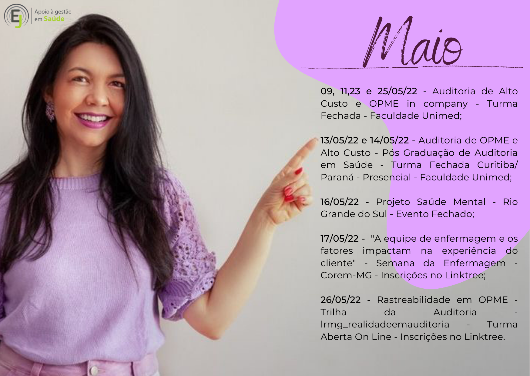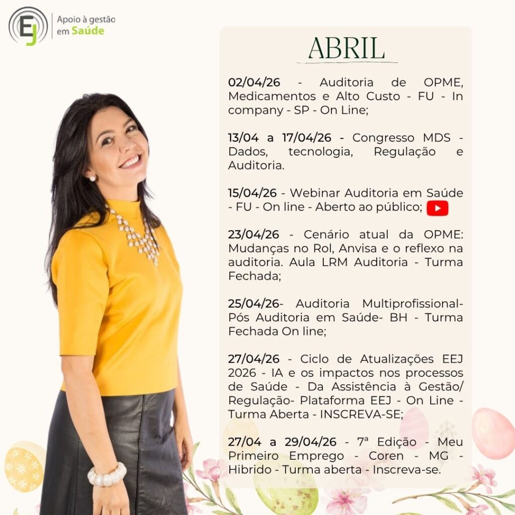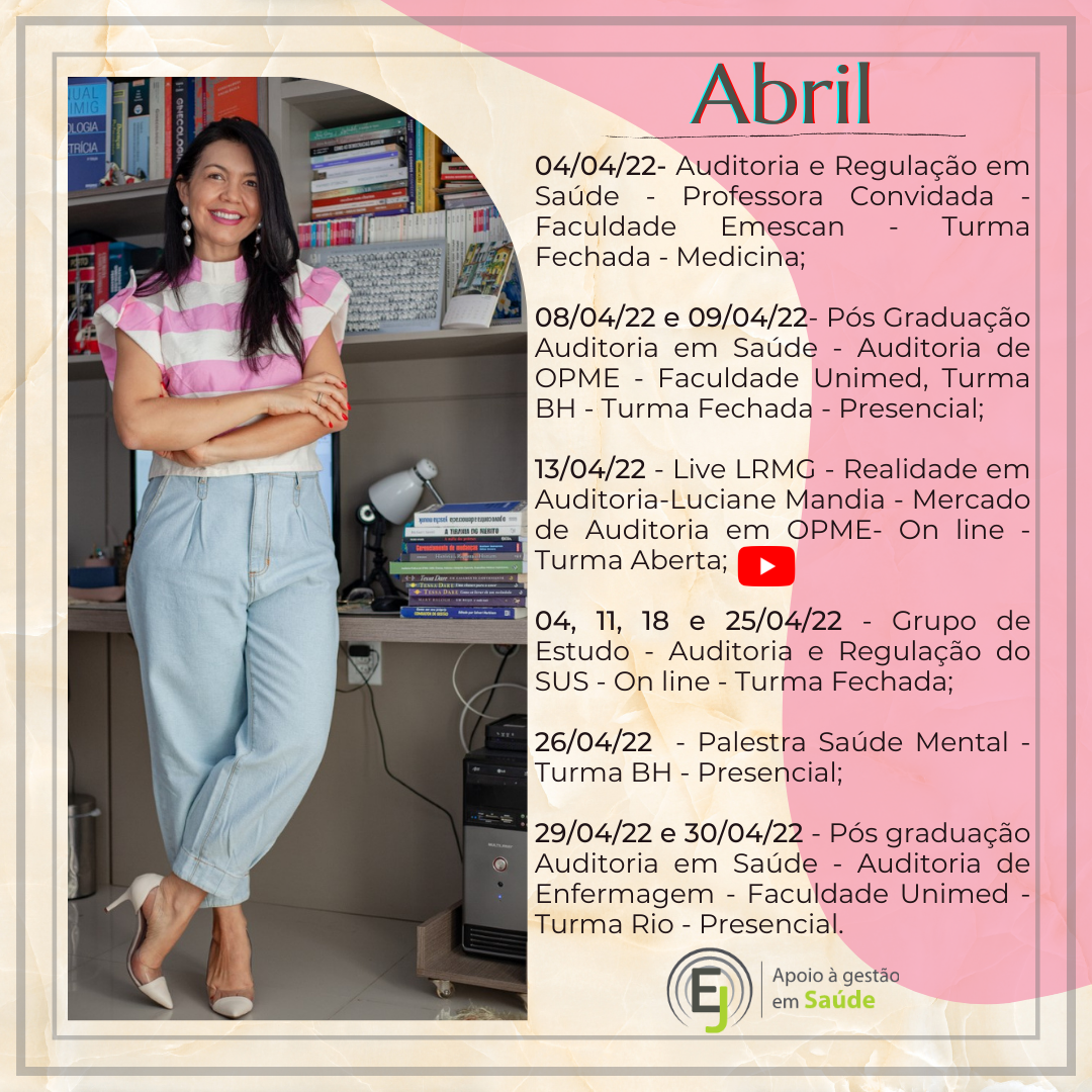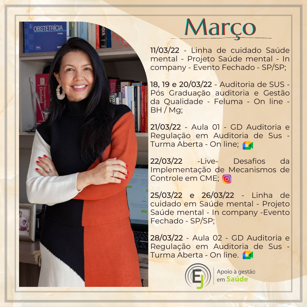 CEO da Empresa E&J Apoio à Gestão de Saúde e Educar LTDA, desenvolvendo atividades de Treinamentos, Consultoria e Auditoria, para o Sistema de Saúde. Tem na carteira de clientes: Amil – MG, Usisaúde, Promed – MG, Professora Convidada do Módulo de Auditoria em Enfermagem e Implantes de OPME’s da Pós Graduação de Auditoria em Saúde da Fundação Unimed e do Curso de OPME da Fundação Unimed; Professora Convidada do Módulo de Modalidades de Auditoria da Pós Graduação em Auditoria da Faculdade de Ciencias Médicas – MG.