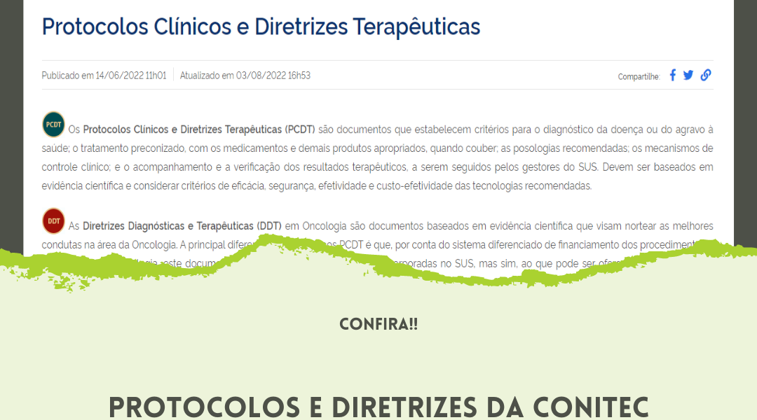 Protocolos Clínicos e Diretrizes Terapêuticas. Os Protocolos Clínicos e Diretrizes Terapêuticas (PCDT) são documentos que estabelecem critérios para o diagnóstico da doença ou do agravo à saúde; o tratamento preconizado, com os medicamentos e demais produtos apropriados, quando couber; as posologias recomendadas; os mecanismos de controle clínico; e o acompanhamento e a verificação dos resultados terapêuticos, a serem seguidos pelos gestores do
