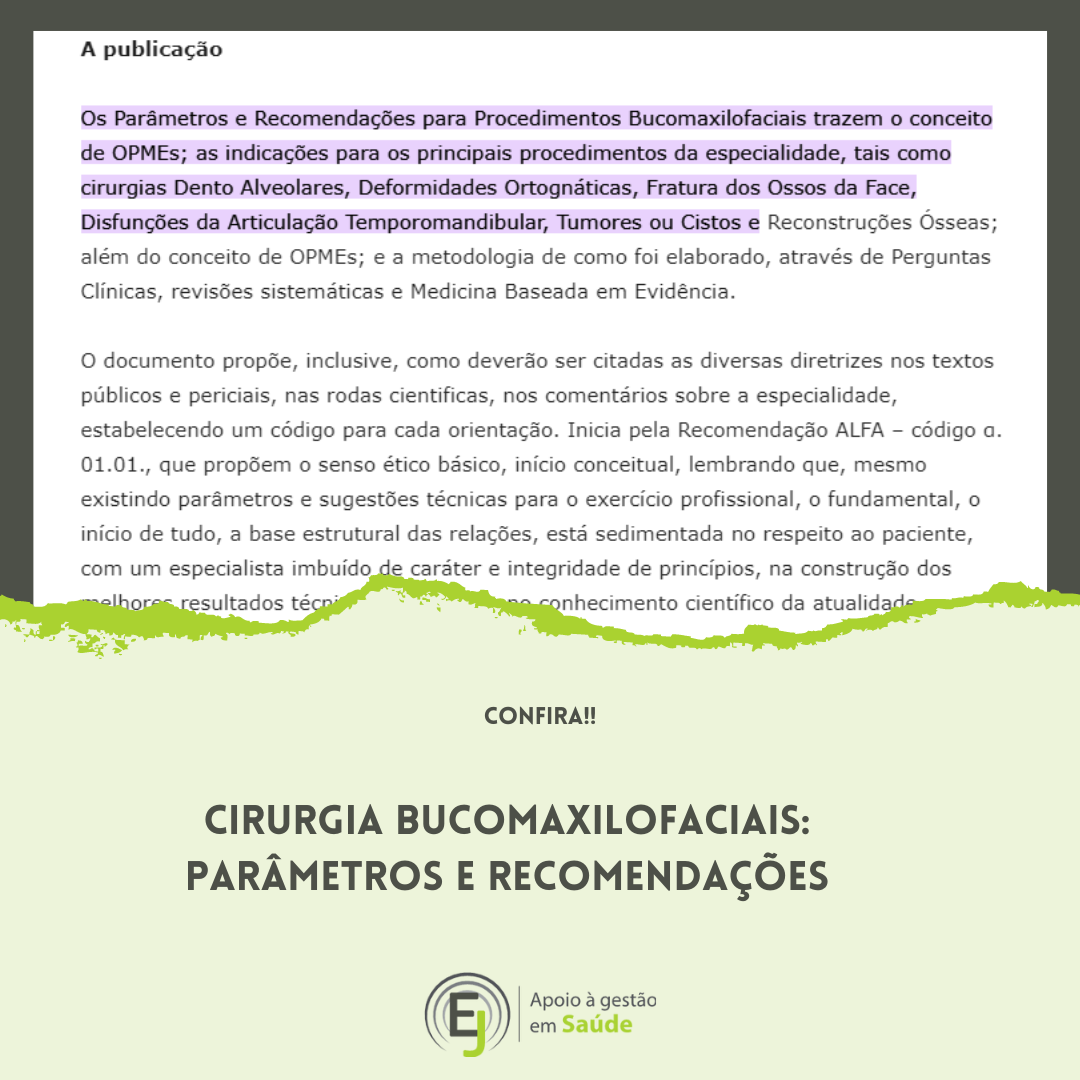 Baseado em evidências científica, Parâmetros e Recomendações para Procedimentos Bucomaxilofaciais, é um documento que procura guiar, eticamente, a atividade cirúrgica e traumatológica bucomaxilo-faciais da ondontologia. A intenção de tais parâmetros e recomendações é que se tornem basilares na tomada de decisão quanto ao tratamento clínico a ser seguido. Além disso, a proposto é que o documento estenda-se a todos os profissionais envolvidos no procedimento, isto é, médicos, clínicas, indústria, planos de saúde, hospitais, os players do setor e servirá ainda para apoio na tomada de decisão em consultorias, auditorias, segundas e terceiras opiniões e laudos periciais. Leia mais.