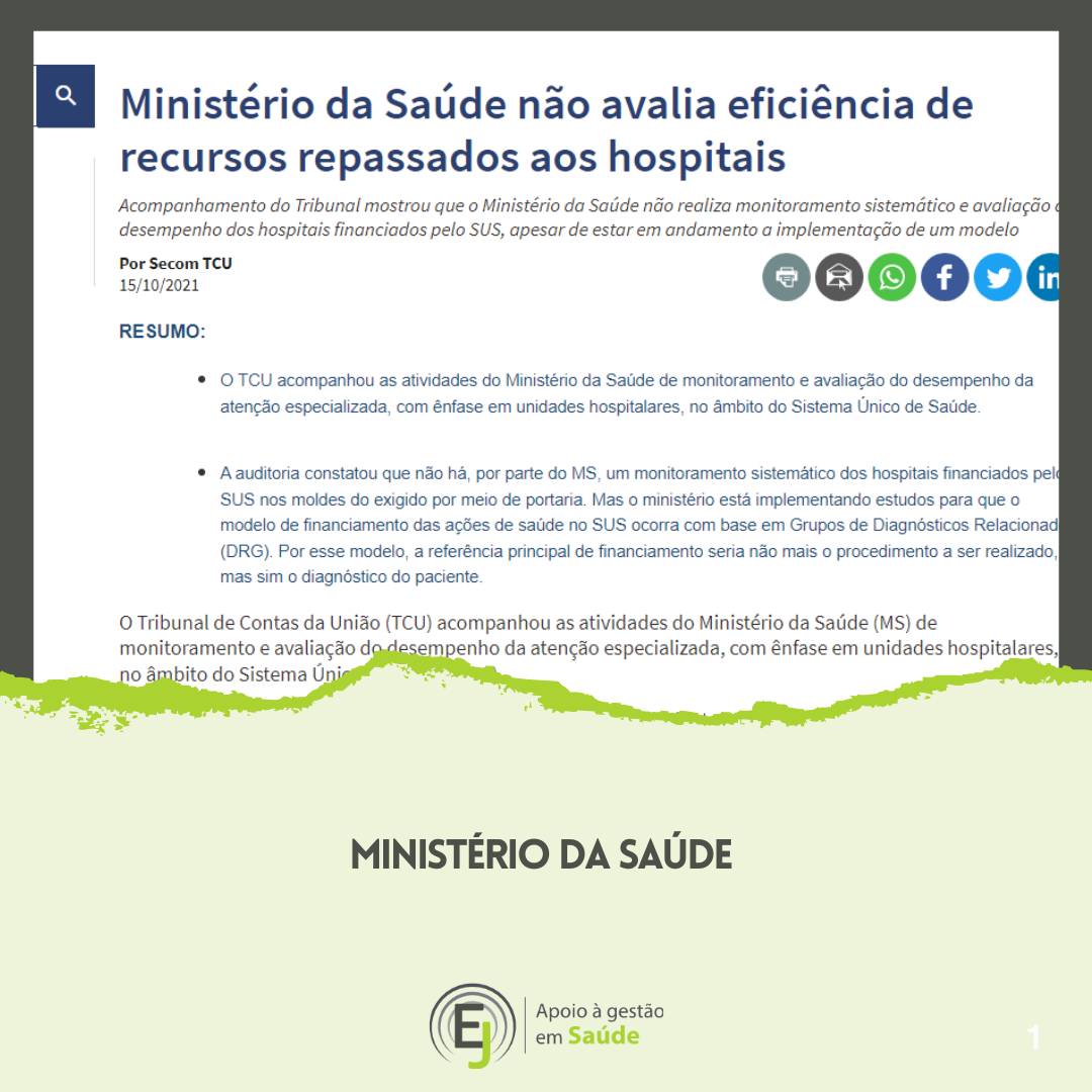 Acompanhamento do Tribunal mostrou que o Ministério da Saúde não realiza monitoramento sistemático e avaliação de desempenho dos hospitais financiados pelo SUS, apesar de estar em andamento a implementação de um modelo.