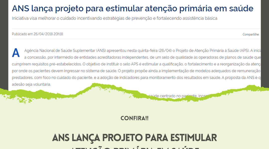 Como temos debatido a necessidade da melhoria da Assistência à Saúde é um melhor foco no Indivíduo, a ANS lançou o projeto da Atenção Primária à Saúde. O Projeto de Atenção Primária à Saúde (APS) consiste na criação de um selo de qualidade às operadoras de planos de saúde que estimularem a prevenção e promoção à saúde dos seus beneficiários.