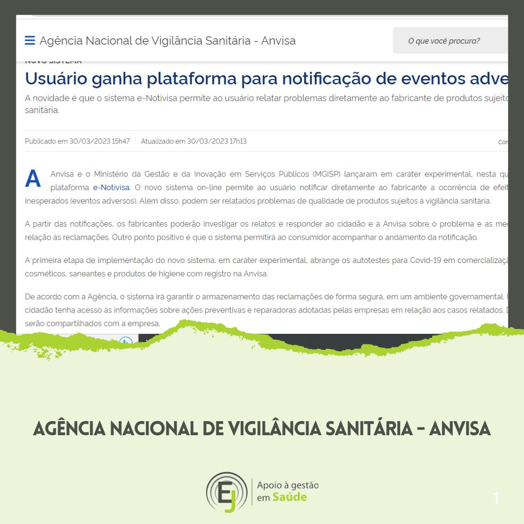A Anvisa e o Ministério da Gestão e da Inovação em Serviços Públicos (MGISP) lançaram em caráter experimental, nesta quinta-feira (30/3), a plataforma e-Notivisa. O novo sistema on-line permite ao usuário notificar diretamente ao fabricante a ocorrência de efeitos indesejados ou inesperados (eventos adversos). Além disso, podem ser relatados problemas de qualidade de produtos sujeitos à vigilância sanitária.
